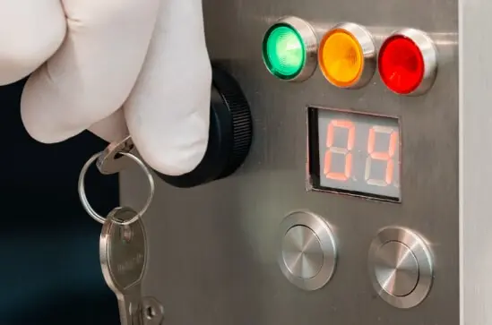 You turn the ignition key to power the device (green light). If you are ready to leave the room, force the key to the right. The timer will start with a beep (one beep per second) and you have 20 seconds to leave the room.