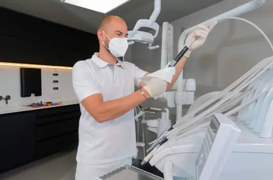 After the departure of your patient, you carry out the routine surface disinfection: seat, operating light, spittoon, and instrument block before completely clearing the work surfaces.