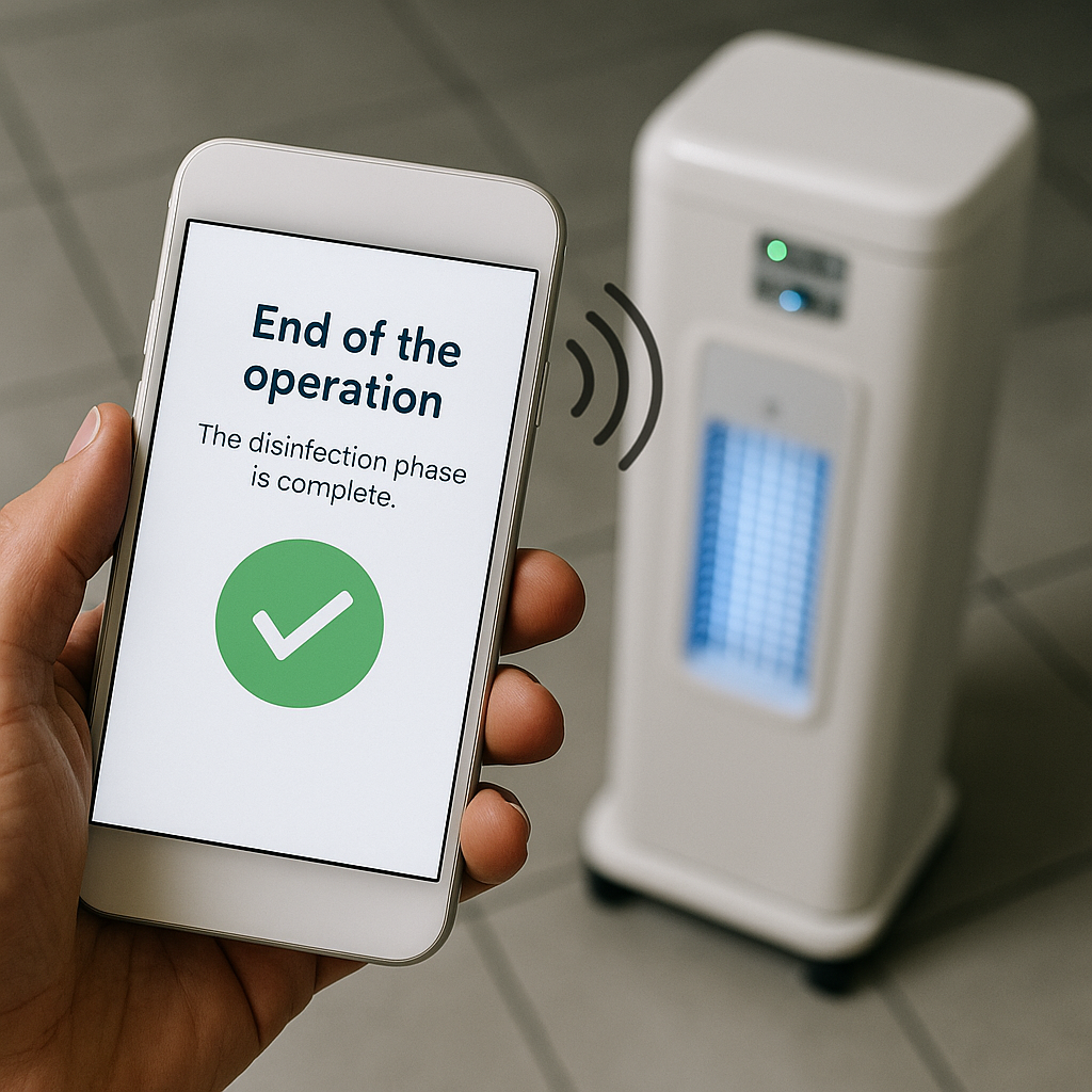 During the operation, you are informed of the progress of the disinfection phase through the application and by the continuous beeping sound emitted by the device throughout the entire process.